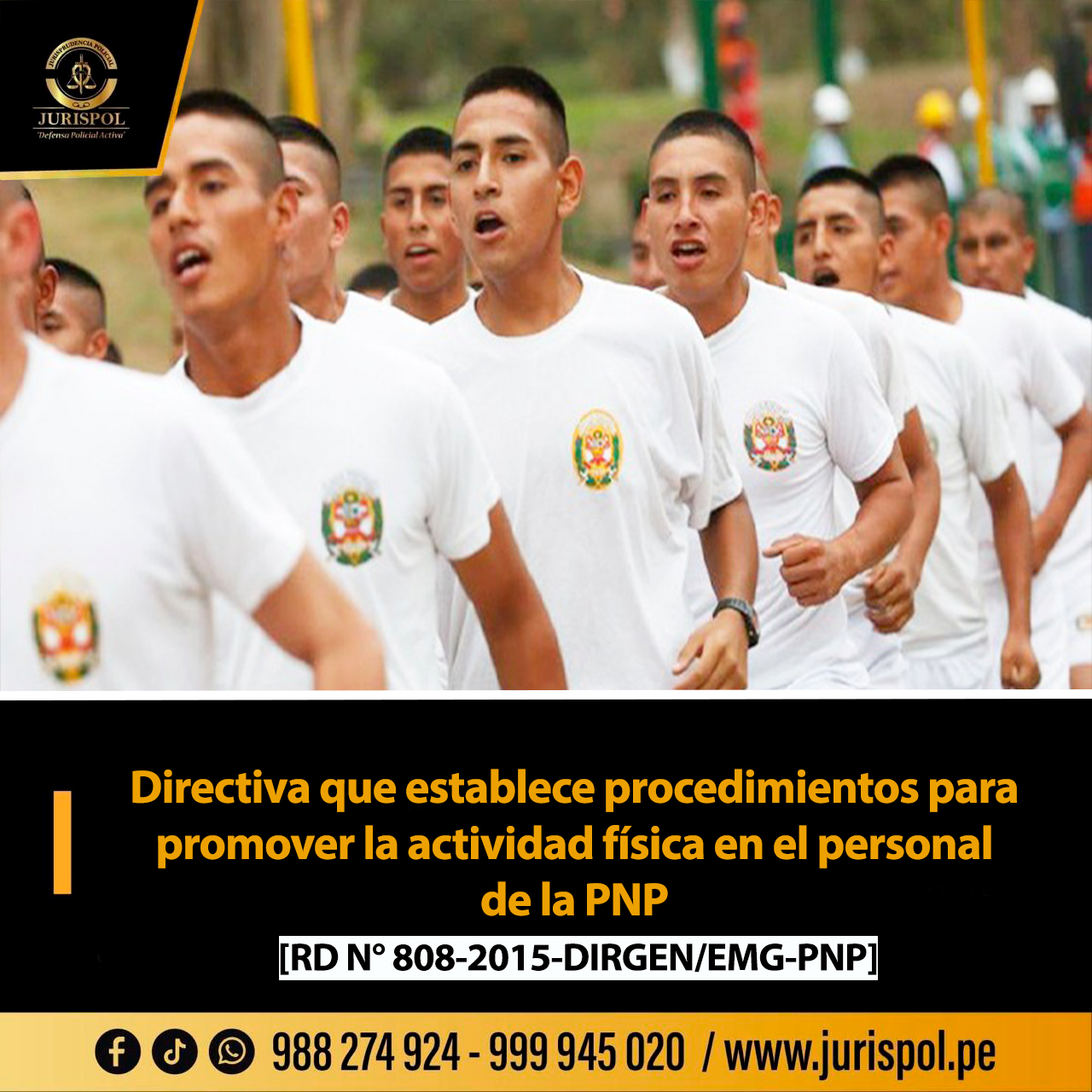 [Directiva PNP] Mediante la RD N° 808-2015-DIRGEN/EMG-PNP, de fecha 17 de octubre de 2015, a través de la Dirección General de la PNP, se aprobó la «Directiva que establece procedimientos para promover la actividad física en el personal de la PNP » ⇒DESCARGA AQUÍ⇐