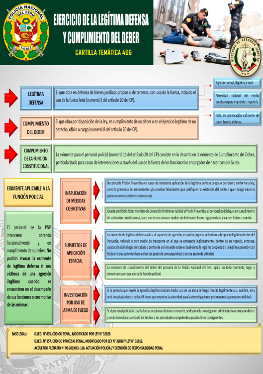 [Cartilla Temática PNP] Mediante La Dirección de Asesoría jurídica de la PNP, el 14MAY2024 , oficializó la elaboración y difusión de la CARTILLA TEMÁTICA 400-2024, «Ejercicio de la Legítima Defensa y Cumplimiento del Deber»; como herramienta técnica y especializada de carácter jurídico para el empoderamiento del servicio policial. ⇒DESCARGA AQUÍ⇐