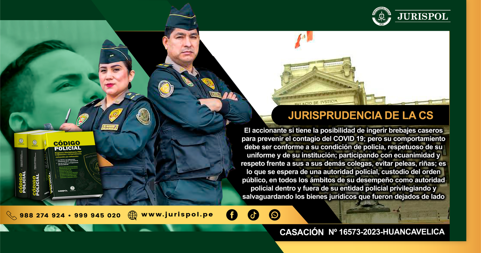 [Resoluciones de la Corte Suprema] Mediante Sentencia recaída en el Recurso de Casación N° 16573-2023-HUANCAVELICA del 08ENE2024, la Primera Sala de Derecho Constitucional y Social Transitoria de la Corte Suprema de Justicia de la República, se pronunció respecto a las infracciones MG-33, MG-35, MG-52 y G-26 «El accionante si tiene la posibilidad de ingerir brebajes caseros para prevenir el contagio del COVID 19; pero su comportamiento debe ser conforme a su condición de policía, respetuoso de su uniforme y de su institución; participando con ecuanimidad y respeto frente a sus a sus demás colegas, evitar peleas, riñas; es lo que se espera de una autoridad policial, custodio del orden público, en todos los ámbitos de su desempeño como autoridad policial dentro y fuera de su entidad policial privilegiando y salvaguardando los bienes jurídicos que fueron dejados de lado.» ⇒DESCARGUE AQUÍ⇐