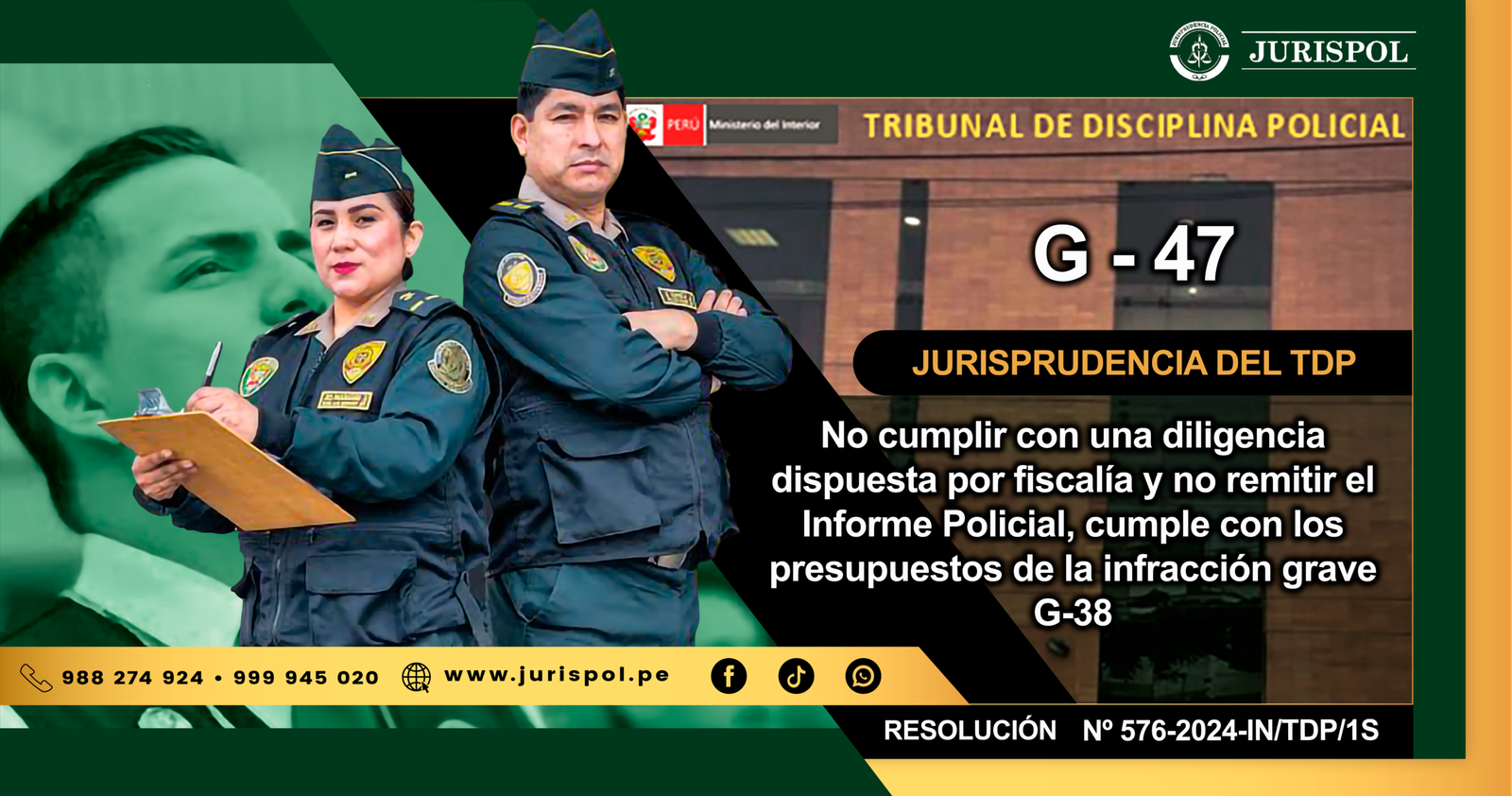 [Resoluciones del TDP] Mediante la Resolución N° 576-2024-IN/TDP/1S, de fecha 25OCT2024, la Primera Sala del Tribunal de Disciplina Policial, se pronunció respecto a la infracción G-38, que actualmente corresponde al Código G-47 «No cumplir con una diligencia dispuesta por fiscalía y no remitir el Informe Policial, cumple con los presupuestos de la infracción grave G-38.» ⇒DESCARGA AQUÍ⇐