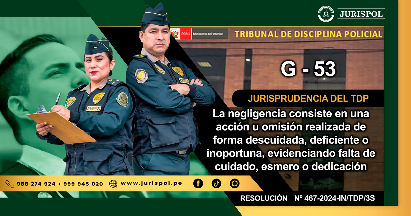 [Resoluciones del TDP] Mediante la resolución N° 467-2024-IN/TDP/3S, de fecha 27AGO2024, la tercera sala del Tribunal de Disciplina Policial, se pronunció respecto a la infracción MG-61, que actualmente corresponde al Código G-53 «Reincidir en no registrar, demorar o negarse a la recepción o registro de la denuncia u ocurrencia de competencia policial o reincidir en no ejercer control para el registro de estas en el sistema informático policial respectivo.» De 4 a 9 días de Sanción de Rigor. ⇒DESCARGA AQUÍ⇐