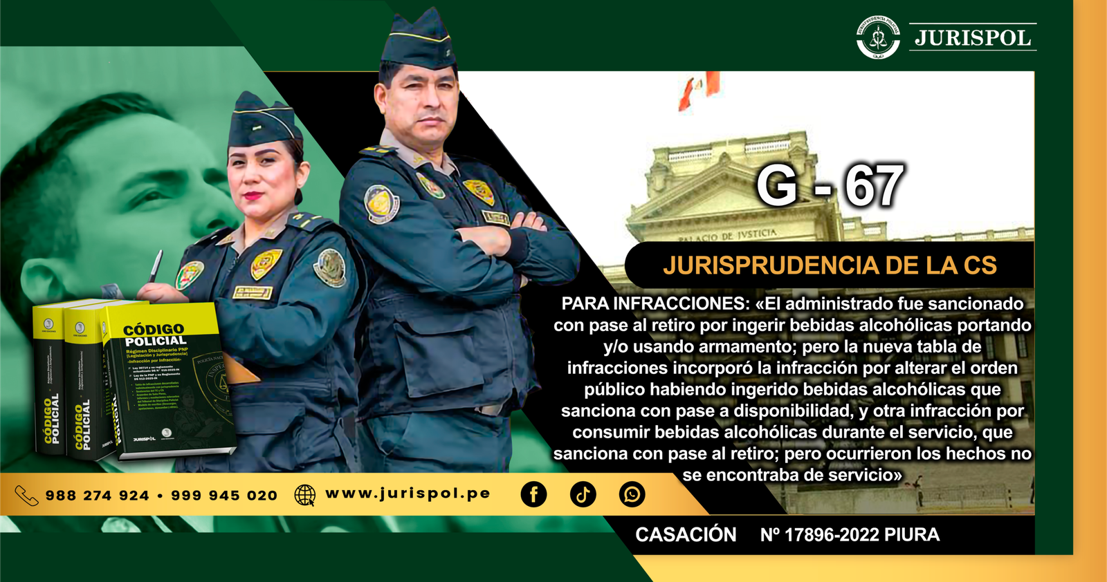 [Resoluciones de la Corte Suprema] Mediante Sentencia recaída en el Recurso de Casación N° 17896-2022-PIURA del 16MAY2022, la Tercera Sala de Derecho Constitucional y Social Transitoria de la Corte Suprema de Justicia de la República, se pronunció respecto a la infracción Muy Grave MG-79, que se relaciona con la infracción de Código G-67 «El administrado fue sancionado con pase al retiro por ingerir bebidas alcohólicas portando y/o usando armamento; pero la nueva tabla de infracciones incorporó la infracción por alterar el orden público habiendo ingerido bebidas alcohólicas que sanciona con pase a disponibilidad, y otra infracción por consumir bebidas alcohólicas durante el servicio, que sanciona con pase al retiro; pero ocurrieron los hechos no se encontraba de servicio.» ⇒DESCARGUE AQUÍ⇐