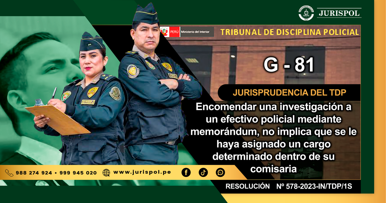 [Resoluciones del TDP] Mediante la resolución Nº 578-2023-IN/TDP/1S, de fecha 31AGO2023, la primera sala del Tribunal de Disciplina Policial, se pronunció respecto a la infracción MG-97, que actualmente corresponde al Código G-81 «Asignar indebidamente cargos a personal policial que no cumple con los requisitos contemplados en la ley.» De 4 a 9 días de sanción Rigor. ⇒DESCARGA AQUÍ⇐