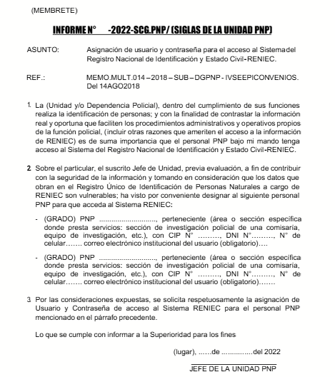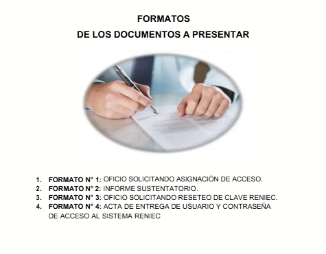 a. Oficio firmado (autentificado con certificado de firma digital), por el jefe de la Unidad, solicitando la asignación de usuario y contraseña de acceso al sistema Reniec, con indicación del personal policial designado.