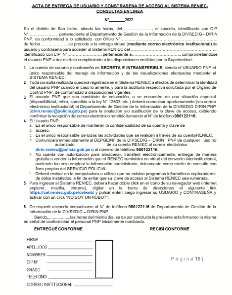 c. En el correo electrónico institucional, también se le adjuntará un Acta de entrega de usuarios y contraseña al sistema RENIEC-Consultas en Linea, el mismo que deberá ser devuelto debidamente firmado y con la impresión digital (en formato PDF escaneado) al mismo correo dirin.reniec@policia.gob.pe.