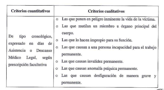 Según el Código Penal, no toda lesión física o psíquica supone la comisión de un delito puesto que, si aquella no llega a cierto nivel de gravedad, nos hallaremos ante una falta. Para establecer dicha diferencia y tipificar jurídicamente un hecho, se han establecido los siguientes criterios: