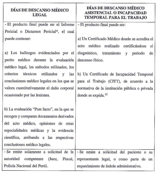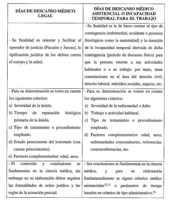 Los días de descanso médico legal no deben confundirse con los días de descanso médico asistencial o de incapacidad temporal para el trabajo, puesto que para su determinación se toman en cuenta los siguientes aspectos diferenciales: