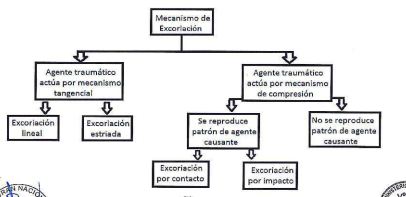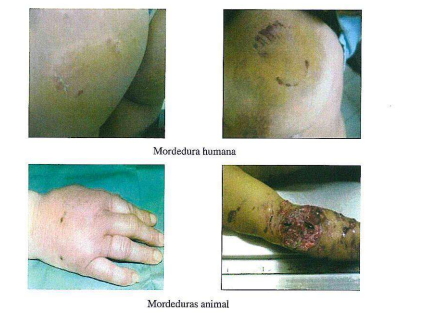 - En pocos casos, la lesión suele orientar hacia un arma o instrumento específico (por ejemplo una equimosis figurada de una cadena, una equimosis figurada de una hebilla de correa, herida de entrada por proyectil de arma de fuego, etc), sin embargo en la gran mayoría de casos, las lesiones son inespecíficas, no expresan el tipo ni la forma del arma o instrumento utilizado, En este escenario, y como ocurre habitualmente, cuando al médico legista se le envía a un ciudadano con oficio en mano donde se solicita la realización del reconocimiento médico legal por lesiones, éste describe las lesiones (tipo de lesión, tamaño, forma, color, ubicación anatómica, etc) y en base al tipo de lesión puede deducir de manera genérica el agente causante (agente contuso, agente cortante, agente contuso cortante, agente con punta, etc).