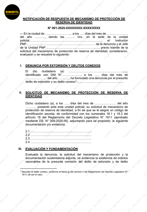 3.1. El instructor notifica al denunciante el documento “notificación de respuesta de mecanismo de protección de reserva de identidad”, en el mismo día de presentada su solicitud, procediendo a notificarlo personalmente en la dependencia policial, en atención a lo prescrito en el numeral 17.3 del artículo 17 del Reglamento del Decreto Legislativo N° 1611.