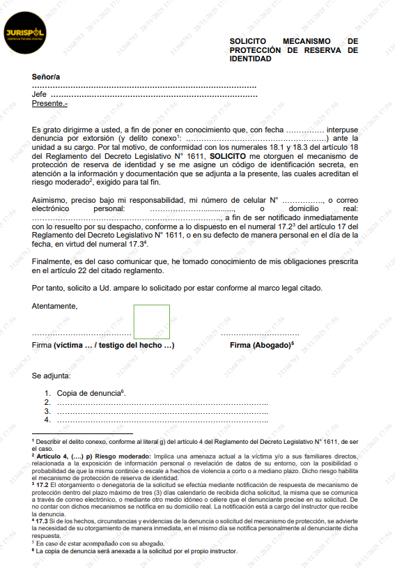 1.3. De requerir el denunciante dicho mecanismo, se pone a disposición el formato de solicitud de mecanismo de protección de reserva de identidad (dirigido al Jefe de la Unidad Especializada de Investigación), a fin de que proceda a su llenado y firma en el mismo día de presentada su denuncia. De estar acompañado con su abogado defensor, éste puede firmar la solicitud.