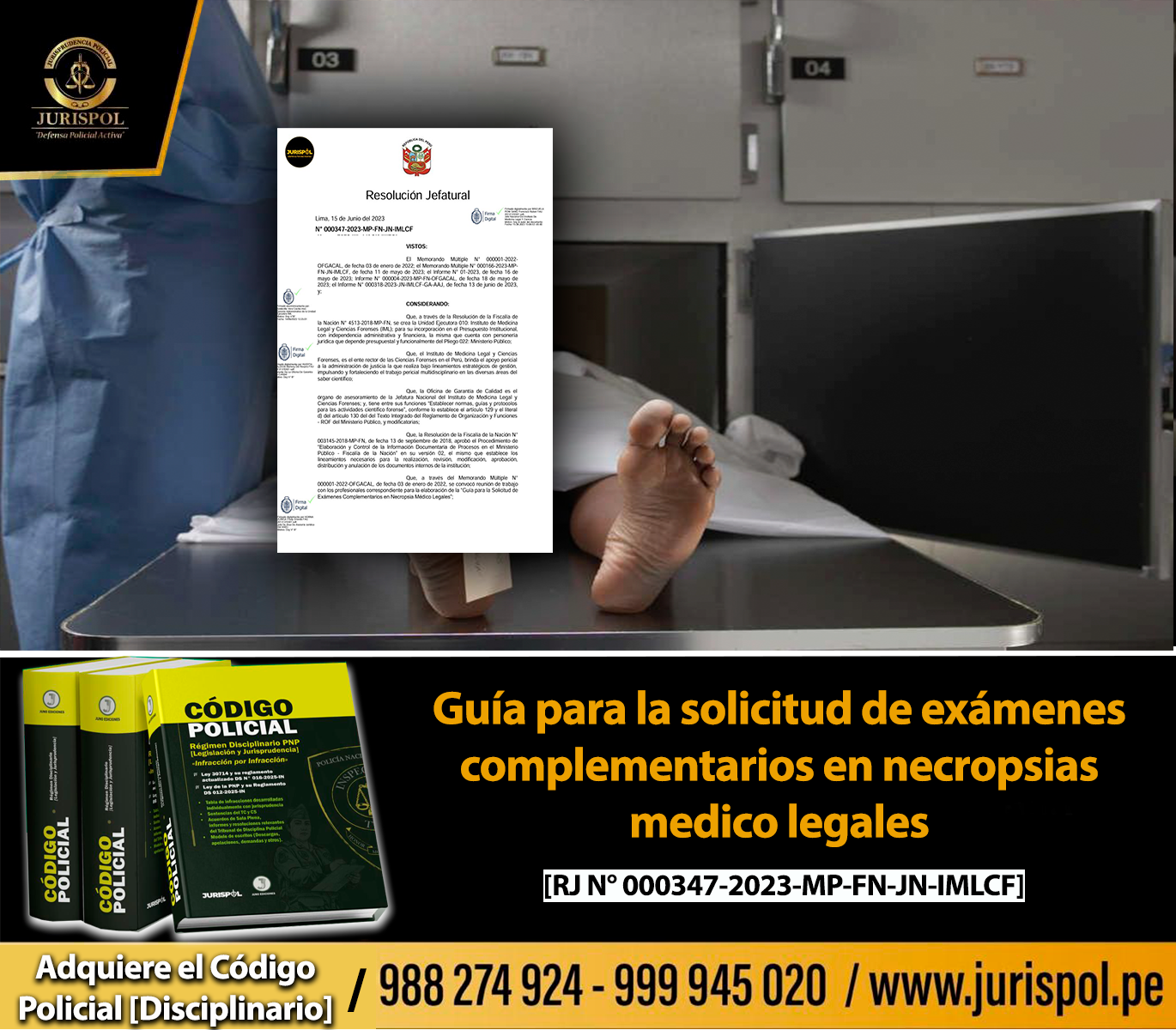 [Guías MP] En virtud de la RJ Nº 000347-2023-MP-FN-JN-IMLCF, de fecha 15 de junio de 2023, a través del Ministerio Público – Fiscalía de la Nación, se aprobó la «Aprobar la Guía para la Solicitud de Exámenes Complementarios en Necropsia Médico Legales que consta de veinticuatro (24) páginas, la misma que forma parte integrante de la presente resolución como anexo» ⇒DESCARGA AQUI⇐