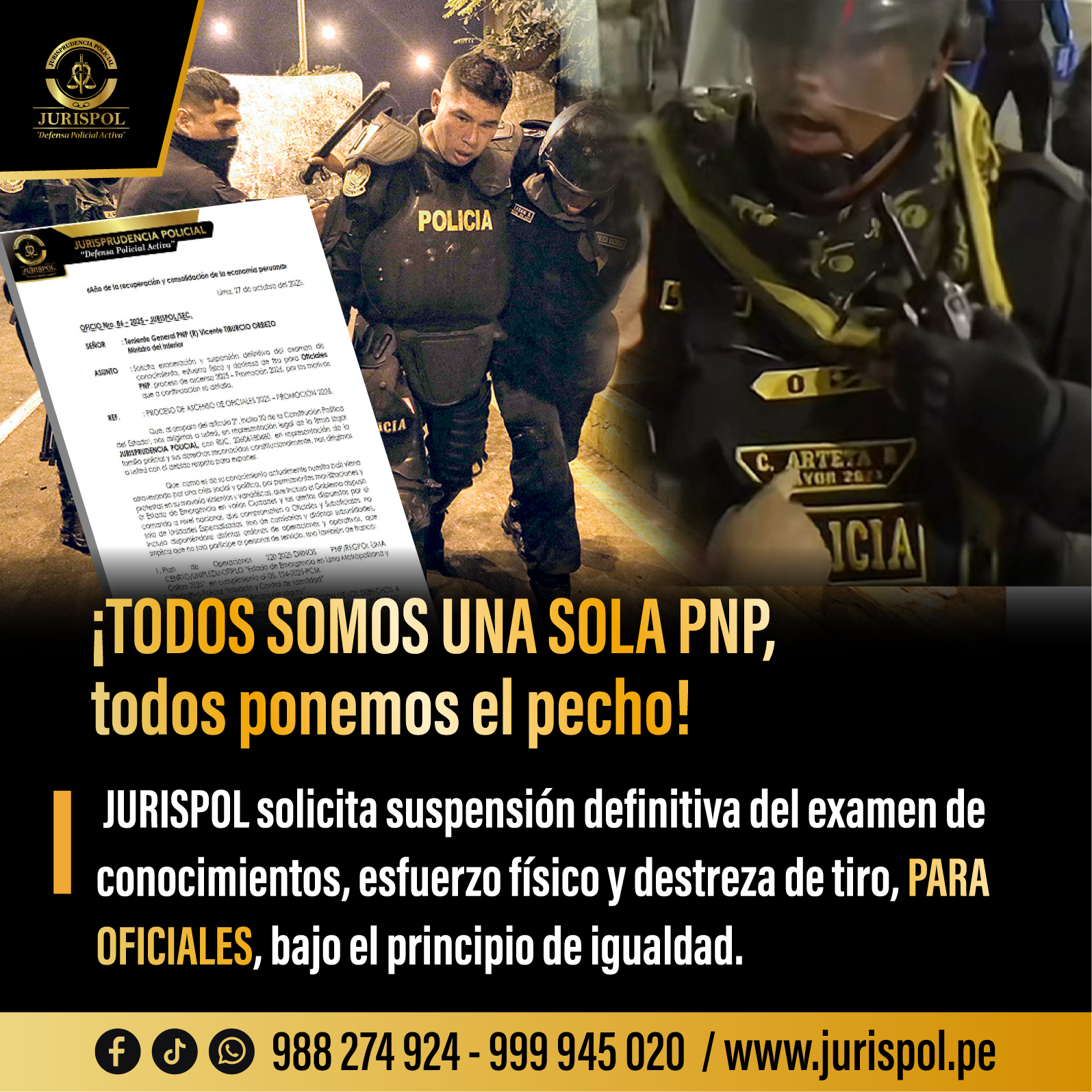 [Escritos Jurispol] Mediante el Oficio N° 86-2025-JURISPOL/SEC, de fecha 27 de octubre de 2025, la firma legal JURISPRUDENCIA POLICIAL ha solicitado la exoneración y suspensión definitiva del examen de conocimiento, esfuerzo físico y destreza de tiro para Oficiales PNP, proceso de ascenso 2025 – Promoción 2026, por los motivos que a continuación se detalla. ⇒DESCARGA AQUÍ⇐