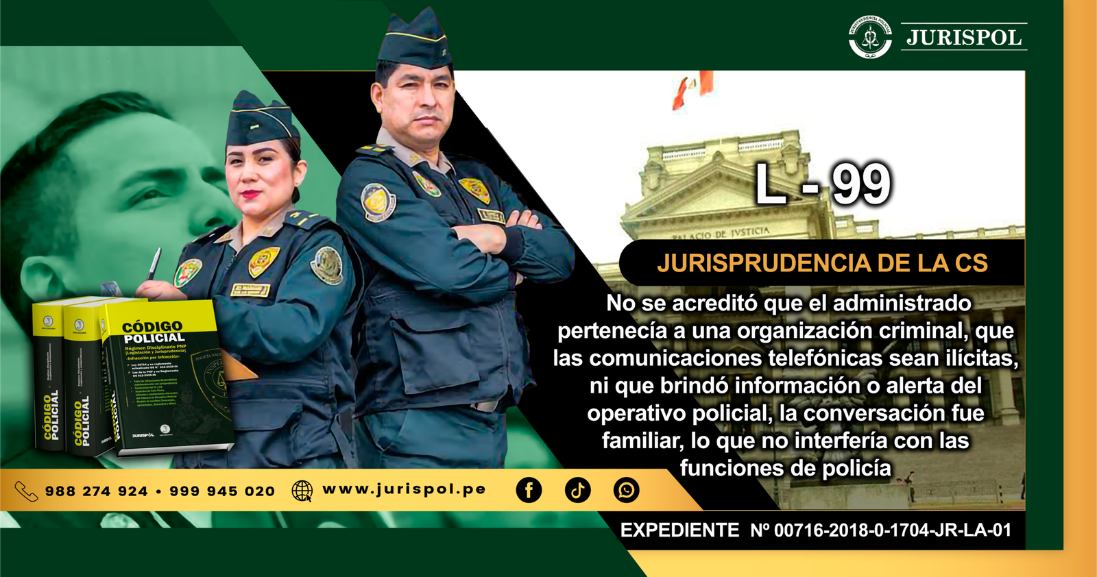 [Resoluciones de la Corte Superior] Mediante Sentencia de Vista del 05OCT2021, recaída en la Resolución N° 12 en el Exp. 00716-2018-0-1704-JR-LA-01, la Sala Descentralizada Mixta y de Apelaciones-Jaén de la Corte Superior de Justicia de Lambayeque se pronunció sobre la infracción Grave G-69, que se relaciona con la infracción de Código L-99 «No se acreditó que el administrado pertenecía a una organización criminal, que las comunicaciones telefónicas sean ilícitas, ni que brindó información o alerta del operativo policial, la conversación fue familiar, lo que no interfería con las funciones de policía.» ⇒DESCARGA AQUÍ⇐