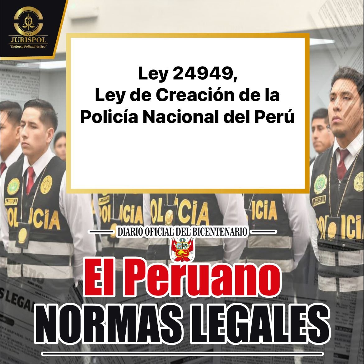 [Leyes] Mediante la Ley N° 24949, publicado el 08 de diciembre de 1988, se crea la Policía Nacional del Perú, donde se unificó a la Guardia Civil, la Policía de Investigaciones y la Guardia Republicana en la nueva entidad policial. ⇒DESCARGA AQUÍ⇐