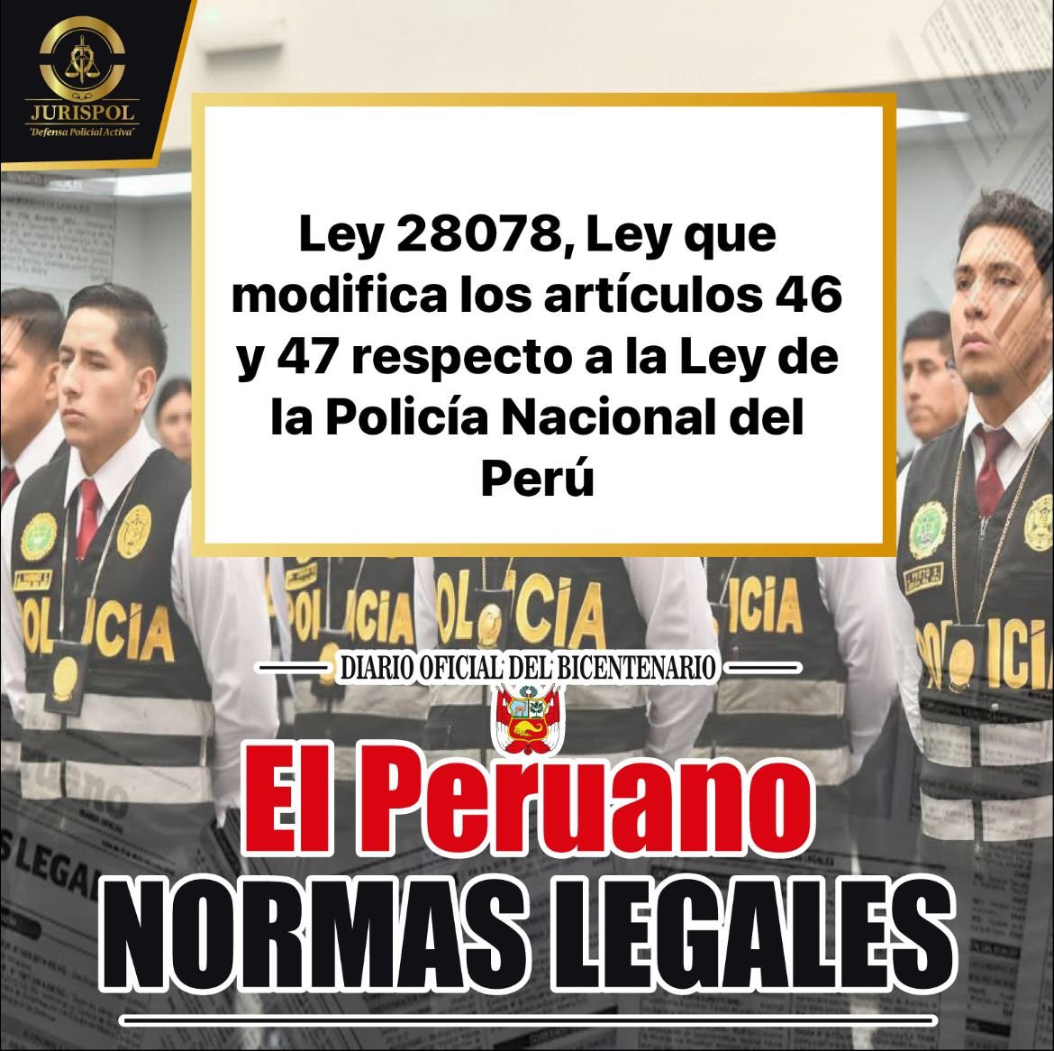 [Ley] Mediante la Ley 28078, publicado el 26 de septiembre de 2003, se modifica los artículos 46 y 47 de la Ley 27238, Ley de la Policía Nacional del Perú. ⇒DESCARGA AQUÍ⇐