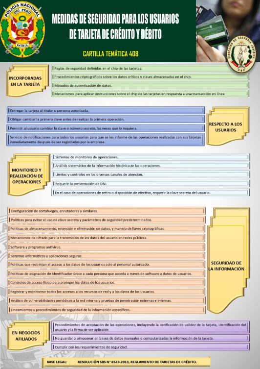 [Cartilla Temática PNP] Mediante La Dirección de Asesoría jurídica de la PNP, el 14JUN2024 , oficializó la elaboración y difusión de la CARTILLA TEMÁTICA 400-2024, «Medidas de Seguridad para los Usuarios de Tarjeta de Crédito y Débito»; como herramienta técnica y especializada de carácter jurídico para el empoderamiento del servicio policial. ⇒DESCARGA AQUÍ⇐