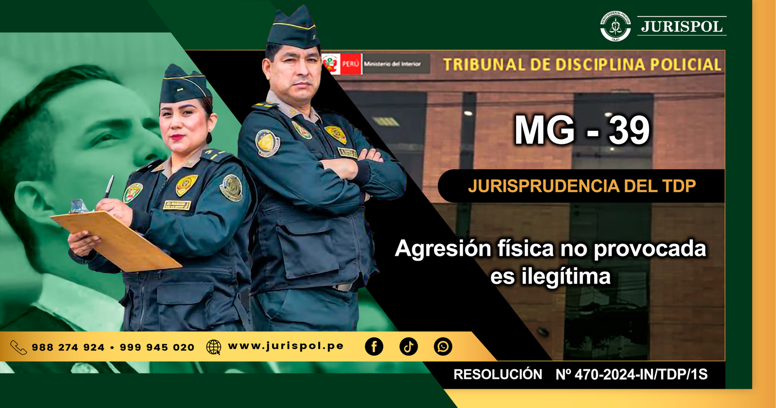 [Resoluciones del TDP] Mediante la Resolución N° 470-2024-IN/TDP/1S, de fecha 19AGO2024, la Primera Sala del Tribunal de Disciplina Policial, se pronunció respecto a la infracción MG-35, que actualmente corresponde al Código MG-39 «Hacer uso de la fuerza en forma innecesaria o desproporcionada en acto de servicio, ocasionando lesiones graves; o emplear sin causa justificada la fuerza física contra el personal de la Policía Nacional del Perú durante el servicio policial, salvo que se trate de hacer prevalecer el principio de autoridad o en legítima defensa.» Que sanciona de 6 meses a 1 año de Pase a la Situación de Disponibilidad. ⇒DESCARGA AQUÍ⇐