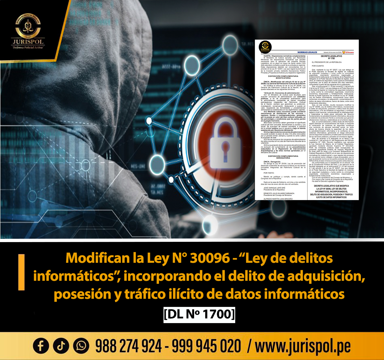 [Decreto Legislativo] Mediante el DL 1700, publicado el 24ENE2026, se modifica la Ley N° 30096 – “Ley de delitos informáticos”, para incorporar el delito de adquisición, posesión y tráfico ilícito de datos informáticos.  [DESCARGA AQUÍ]