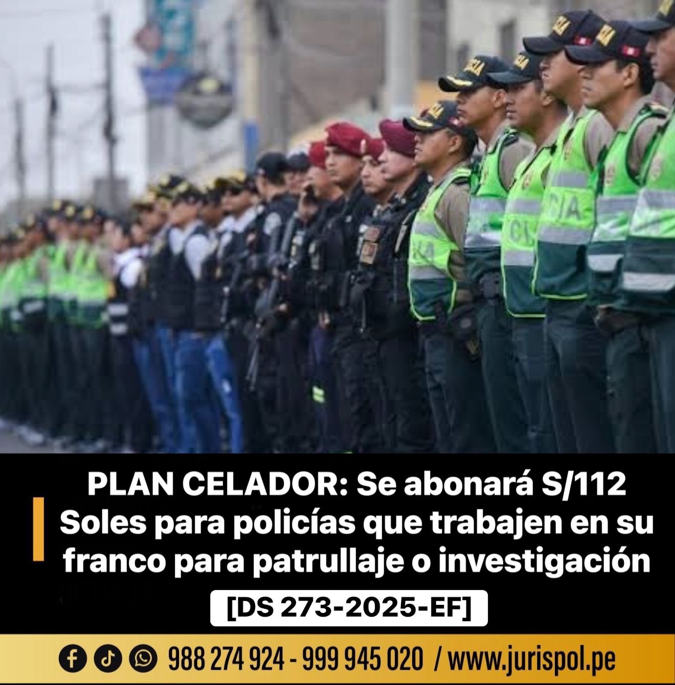 ⇒DESCARGA AQUÍ⇐ «PLAN CELADOR: Se abonara S/ 112 soles para policías que trabajen en su franco para patrullaje o investigación [DS 273-2025-EF]»