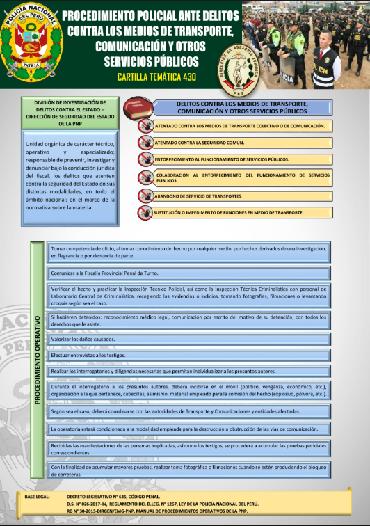 [Cartilla Temática PNP] Mediante La Dirección de Asesoría jurídica de la PNP, el 13SEP2024, oficializó la elaboración y difusión de la CARTILLA TEMÁTICA 430-2024, «Procedimiento Policial Ante Delitos Contra los Medios de Transporte, Comunicación y otros Servicios Públicos»; como herramienta técnica y especializada de carácter jurídico para el empoderamiento del servicio policial. ⇒DESCARGA AQUÍ⇐