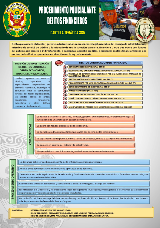 [Cartilla Temática PNP] Mediante La Dirección de Asesoría jurídica de la PNP, el 07MAR2024 , oficializó la elaboración y difusión de la CARTILLA TEMÁTICA 385-2024, «Procedimiento Policial Ante Delitos Financieros»; como herramienta técnica y especializada de carácter jurídico para el empoderamiento del servicio policial. ⇒DESCARGA AQUÍ⇐