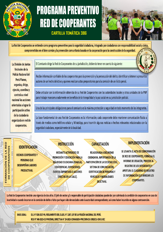 [Cartilla Temática PNP] Mediante La Dirección de Asesoría jurídica de la PNP, el 07MAR2024 , oficializó la elaboración y difusión de la CARTILLA TEMÁTICA 386-2024, «Programa Preventivo Red De Cooperantes»; como herramienta técnica y especializada de carácter jurídico para el empoderamiento del servicio policial. ⇒DESCARGA AQUÍ⇐