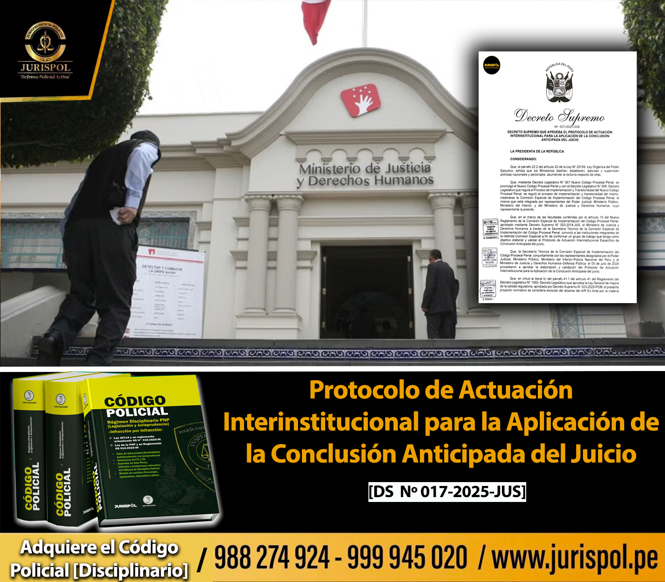 [Protocolos PNP] Mediante el Decreto Supremo N° 017-2025-JUS, de fecha 03OCT2025, a través del Ministerio de Justicia y Derechos Humanos, se aprobó el «Protocolo de Actuación Interinstitucional para la Aplicación de la Conclusión Anticipada del Juicio» ⇒DESCARGA AQUÍ⇐
