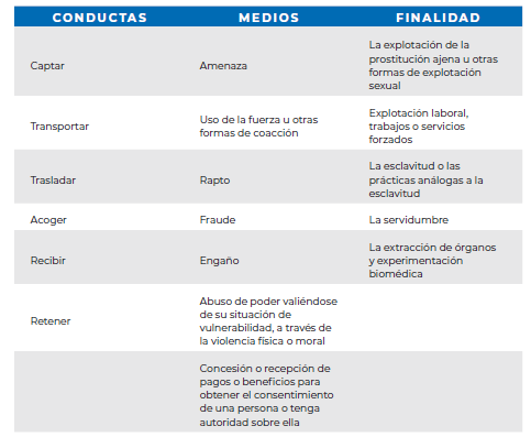 Se entenderá por trata de personas a la captación, el transporte, el traslado, la acogida o la recepción de personas, recurriendo a la amenaza o al uso de la fuerza u otras formas de coacción, al rapto, al engaño, al abuso de poder o de una situación de vulnerabilidad, o a la concesión o recepción de pagos o beneficios para obtener el consentimiento de una persona que tenga autoridad sobre otra, con fines de explotación sexual, trabajos o servicios forzados, esclavitud o prácticas análogas a la esclavitud, servidumbre, extracción de órganos, entre otros fines que no respeten los derechos fundamentales de las personas.