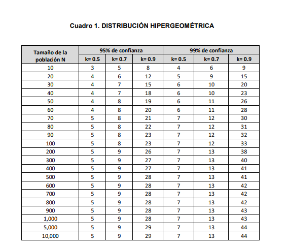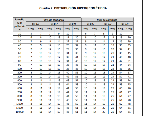 5.2. Distribución hipergeométrica: Es un método estadístico, cuyo modelo matemático permite calcular un tamaño de muestra de n unidades que deben utilizarse para que al menos k unidades sean positivas con un nivel de confianza (1-0)100%