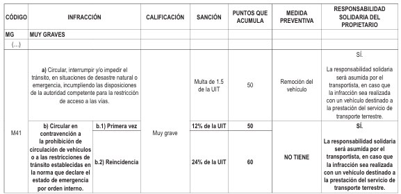 Que, la Dirección General de Políticas y Regulación en Transporte Multimodal, sustenta la necesidad de adecuar la tipificación de la infracción de código M41 del Numeral 1- Conductores/as de Vehículos Automotores del Anexo I «Cuadro de Tipificación de Infracciones, Sanciones, Medidas Preventivas y Control de Puntos Aplicables a las Infracciones al Tránsito Terrestre del citado Reglamento Nacional de Tránsito, así como de graduar su sanción; además, de precisar la circulación de vehículos en lugares declarados en estado de emergencia por orden interno, garantizando un régimen sancionador claro, previsible y proporcional;