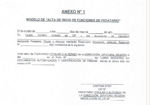 1. Elaborar y suscribir el «Acta de Inicio de Funciones de Fedatario», en el que se señale el número de la resolución con la que ha sido designado, sus nombras y apellidos completos, el número de su documento nacional de identidad (DNI), número de Carne de Identidad Policial (CIP), domicilio real, unidad donde presta servicios, fecha en la que inicia sus funciones como fedatario, el número de folio que contiene el Libro, el cual debe ser insertado al «Libro de Registro de Documentos Autenticados y Certificación de Firmas», según el ANEXO N° 1 del presente Reglamento.