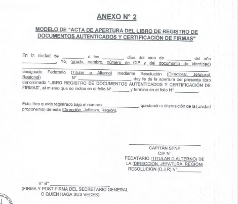 3. El «Libro de Registro de Documentos Autenticados y Certificación de Firmas consta en formato físico, su apertura se efectúa mediante el levantamiento del «Acta de Apertura», que debe contar con el visto bueno del Jefe de la Unidad de Trámite Documentario de la Secretaria Ejecutiva, de la Unidad de Recepción Documental o del que haga sus veces, el mismo que es insertado en el citado libro y contiene la fecha de inicio y el número de folios que contiene, conforme el ANEXO N» 2 del presente reglamento.