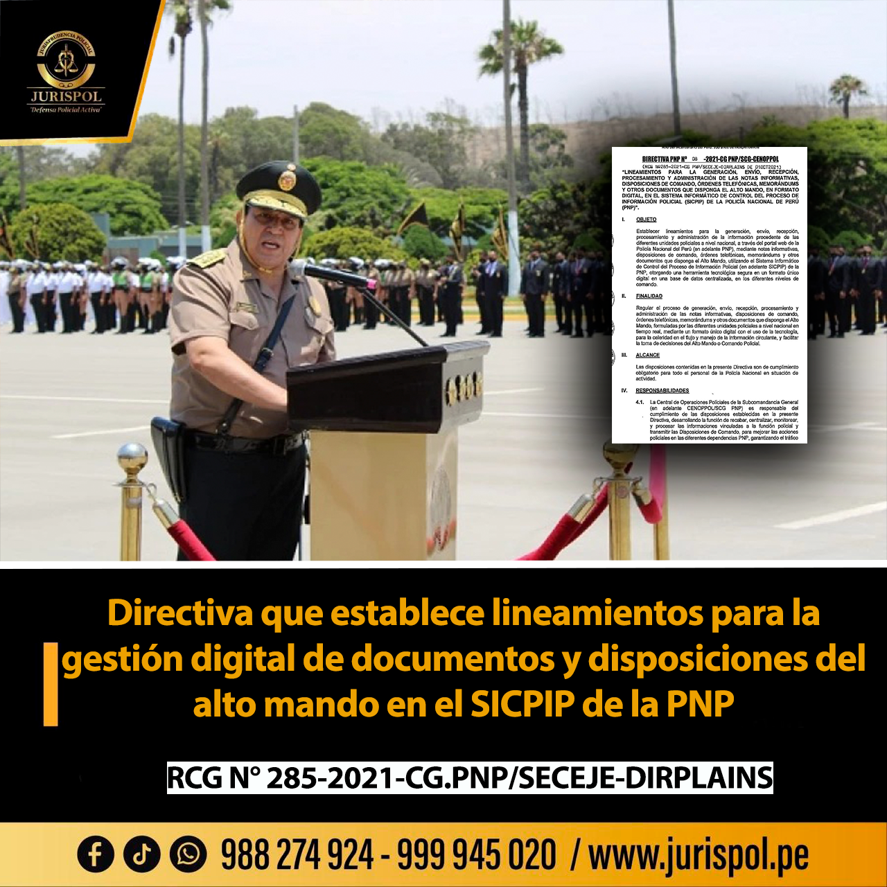 [Directivas PNP] Mediante la RCG N° 285-2021-CG.PNP/SECEJE-DIRPLAINS, de fecha 01 octubre de 2021, a través de la Comandancia General de la PNP, se aprobó la «Directiva que establece lineamientos para la generación, envío, recepción, procesamiento y administración de las notas informativas, disposiciones de comando, órdenes telefónicas, memorándums y otros documentos que disponga el alto mando, en formato digital, en el sistema informático de control del proceso de información policial (sicpip) de la PNP» ⇒DESCARGA AQUÍ⇐