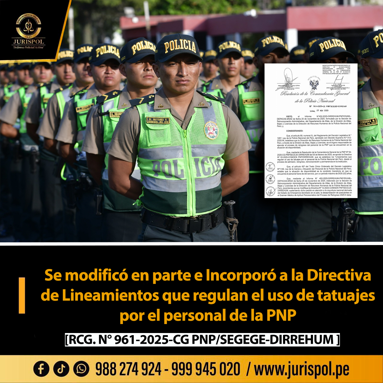 [Directivas PNP] Mediante la RCG. N°961-2025-DIRREHUM-PNP/DIVABL- DEPACAS.SRAD, de fecha 27 de noviembre de 2025, se modificó en parte en incorporo a la Directiva [Nº 02-2025- COMGEN PNP/DIRREHUM], que establece los «Lineamientos que regulan el uso de tatuajes por el personal de la Policía Nacional del Perú, desde el proceso de admisión, reingreso, reincorporación y permanencia en la institución» ⇒DESCARGUE AQUÍ⇐