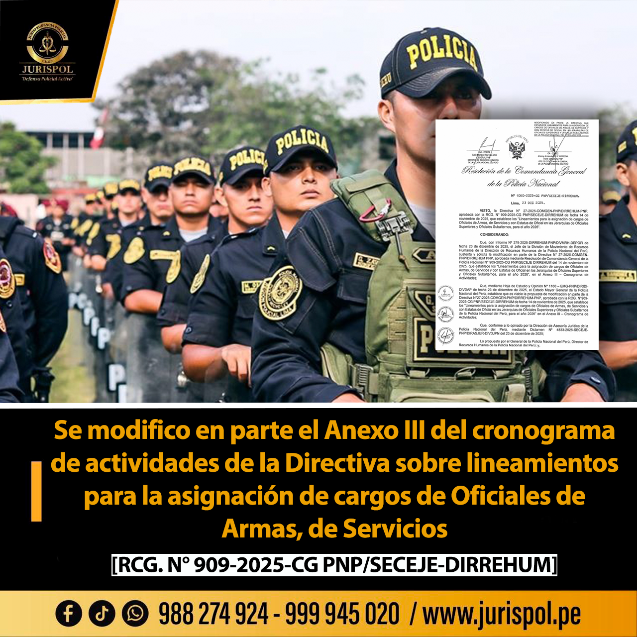 [Directivas PNP] En virtud de la RCG. N° 909-2025-CG PNP/SECEJE-DIRREHUM, de fecha 14 de noviembre de 2025, se modificó en parte el Anexo III del Cronograma de Actividades de la Directiva N°27-2025-COMGEN-PNP/DIRREHUM-PNP, que establece los «Lineamientos para la asignación de cargos de Oficiales de Armas, de Servicios y con Estatus de Oficial en las Jerarquías de Oficiales Superiores y Oficiales Subalternos de la Policía Nacional del Perú, para el año 2026» ⇒DESCARGUE AQUI⇐