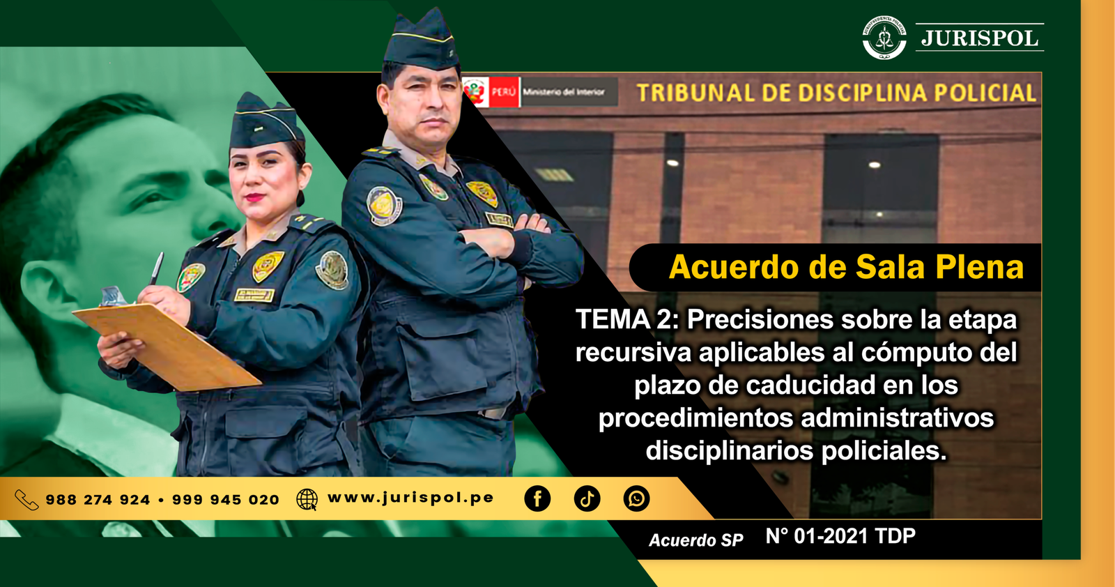 [Acuerdo de Sala plena del TDP] Con fecha 01 de diciembre de 2021, se publicó en el diario oficial «El Peruano» el TEMA 2 del Acuerdo de Sala Plena N° 01-2021, aprobado mediante la Resolución de Presidencia N° 0010-2021-P-TDP/IN, del 01DIC2021, sobre las precisiones de la etapa recursiva aplicables al cómputo del plazo de caducidad en los procedimientos administrativos disciplinarios policiales ⇒DESCARGA AQUÍ⇐