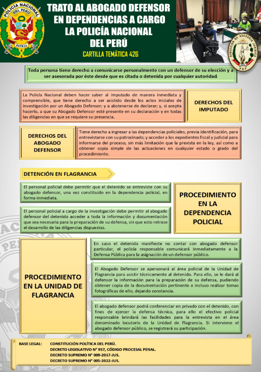 [Cartilla Temática PNP] Mediante La Dirección de Asesoría jurídica de la PNP, el 22AGO2024, oficializó la elaboración y difusión de la CARTILLA TEMÁTICA 426-2024, «Trato al Abogado Defensor en Dependencias a Cargo la PNP»; como herramienta técnica y especializada de carácter jurídico para el empoderamiento del servicio policial. ⇒DESCARGA AQUÍ⇐